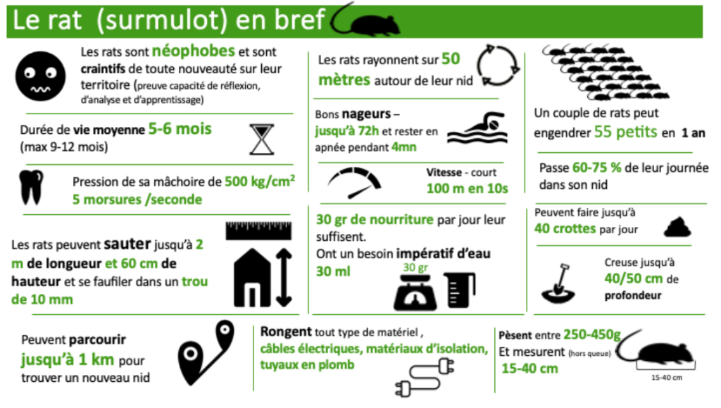 Les rats et les souris appartiennent à la famille des muridés. Le rat brun, très présent à Paris, est extrêmement adaptable. Leur dentition pousse en continu : ils rongent les câbles, gaines, matériaux isolants et peuvent même attaquer des fils électriques.