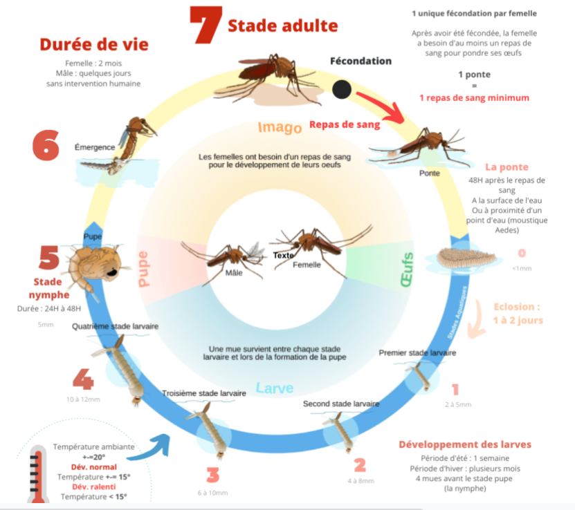 Le développement du moustique dépend directement de la température. Il se déroule en 7 grandes phases, dont quatre stades larvaires, un stade nymphal, puis l’émergence de l’adulte.